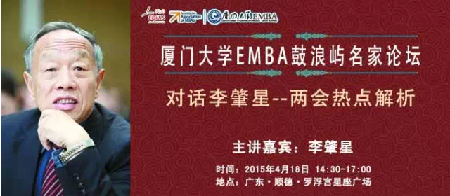 2015年4月18日,“平民外长”李肇星将亲临厦大EMBA鼓浪屿(华南)名家论坛,分享中国外交史上的经典故事,把脉时代脉搏,解析两会热点。诚邀您莅临现场,零距离感受其“嬉笑怒骂皆风采”的独特魅力;欢迎您畅所欲言,亲眼见证其“答中外记者问”的急智艺术。