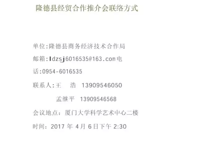 为力促校、县双方进一步创新结对帮扶协作机制,拓展协作领域,丰富协作内容,增强协作实效,隆德县商务经济技术合作局将借厦门大学96周年校庆之际,在厦门大学举行“隆德县经贸合作推介会”,欢迎广大校友企业前来参会!
