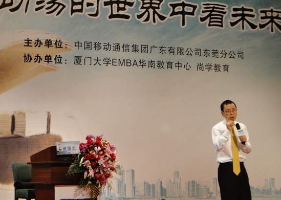11月26日,厦门大学EMBA华南教育中心联合中国移动东莞分公司邀请到著名经济学家谢国忠先生做客东莞,主讲《动荡的世界中看未来》。谢国忠先生用独到的视角为大家分析未来经济的走向。