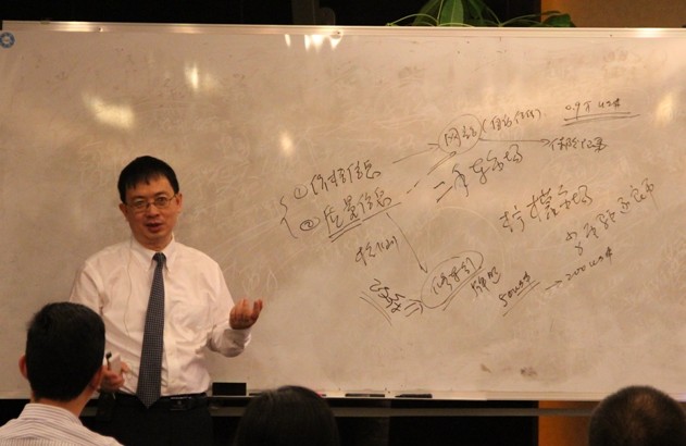 紧接着第三,四天是由梁小民教授授课。梁教授已68岁,但站在讲台上思路清晰,逻辑分明,条理清楚,声音洪亮,让在座的学员们感到非常敬佩,他没有用PPT,也没有任何讲义,就是一个白板,一只水笔就给同学们洋洋洒洒的讲授了生产成本与企业效率、市场结构与策略行为、策略(博弈)行为和定价方法、政府规制与企业的宏观经济政策环境等专题。